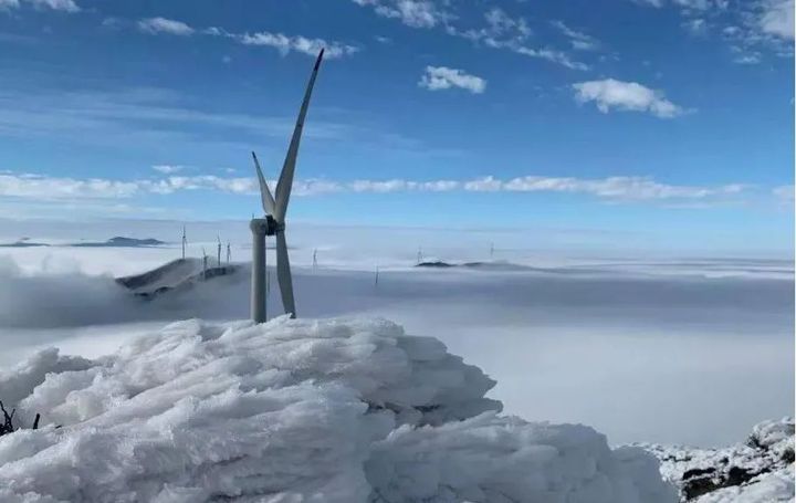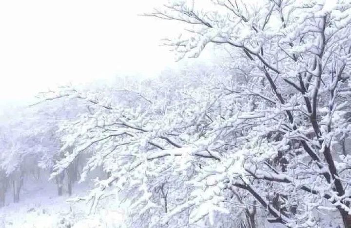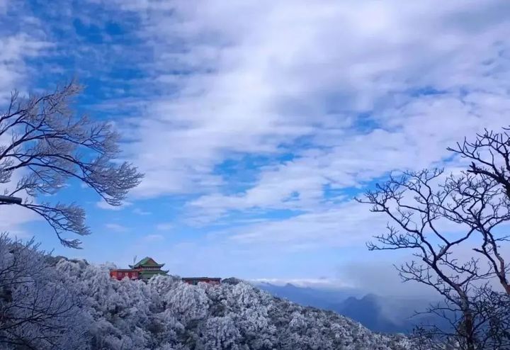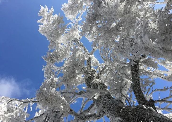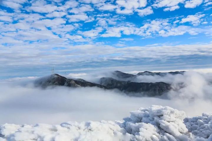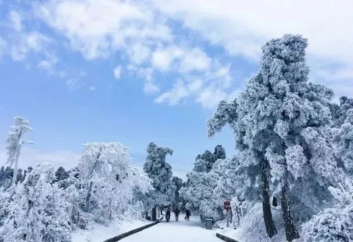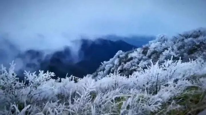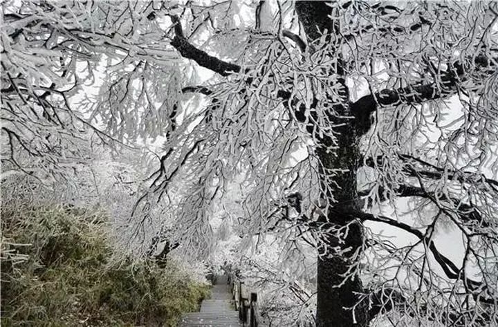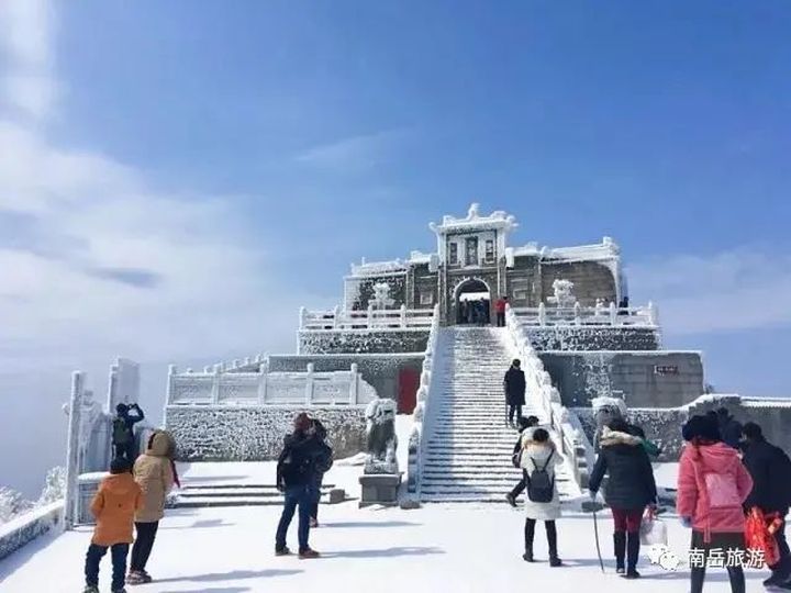 此時衡山之上,霧凇覆蓋山巒、上下一白