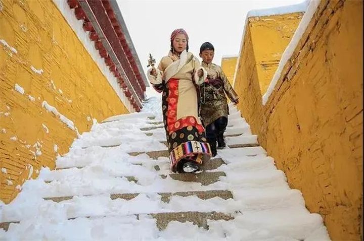 通往拉卜楞寺的路上時常會看到神態莊重,三步一叩首,五步一磕頭的虔誠藏族群眾或信徒。 寒冷冬日,落了雪的拉卜楞寺,純淨的仿佛那些曾經匍匐前行的善良靈魂。
