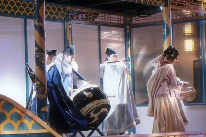 樂曲聲響起,舞者們身著飄逸襦裙翩翩起舞,一顰一笑盡顯盛世景象。
