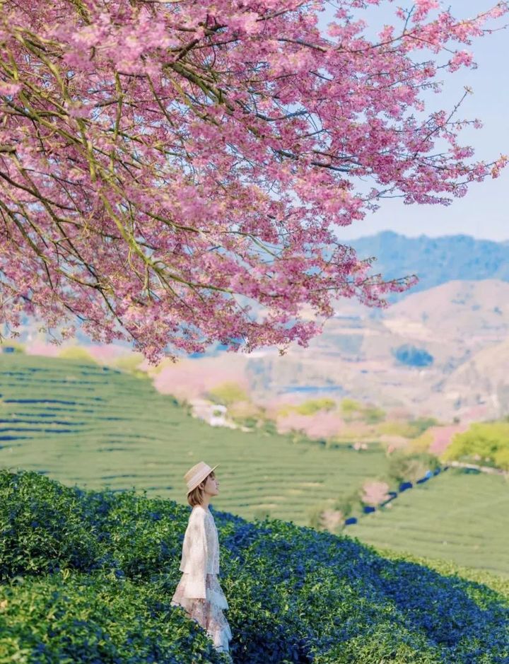 暖陽斜照在一株株櫻花樹上,將樹影長長地勾畫在茶園裡,漫天的粉色足以撩起你滿滿的少女心,襯上藍天白雲,翠綠的茶樹,更是美得令人欣喜。