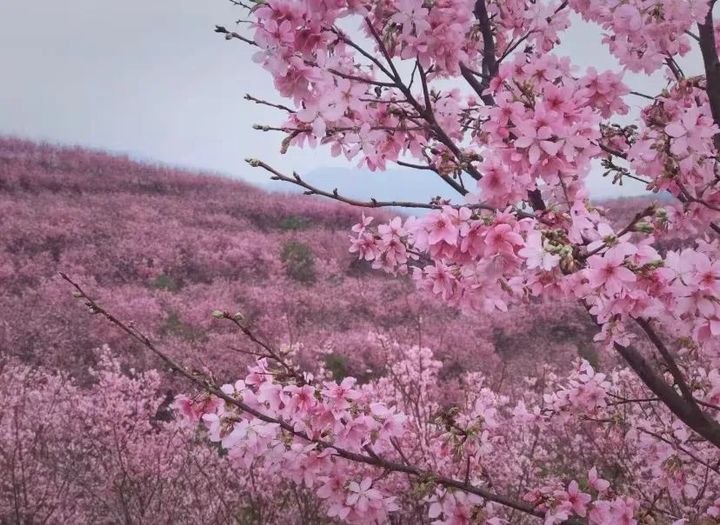 賴坊鎮姚家村的千畝櫻花園,每到花期滿山遍野盛開的櫻花如同一片粉色花海,不管是近看遠看都美極了。