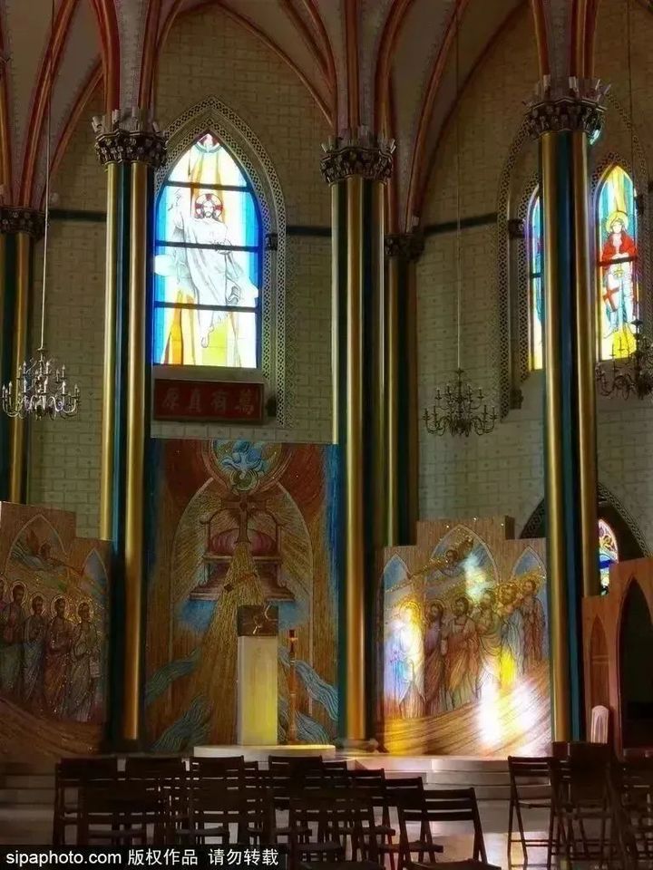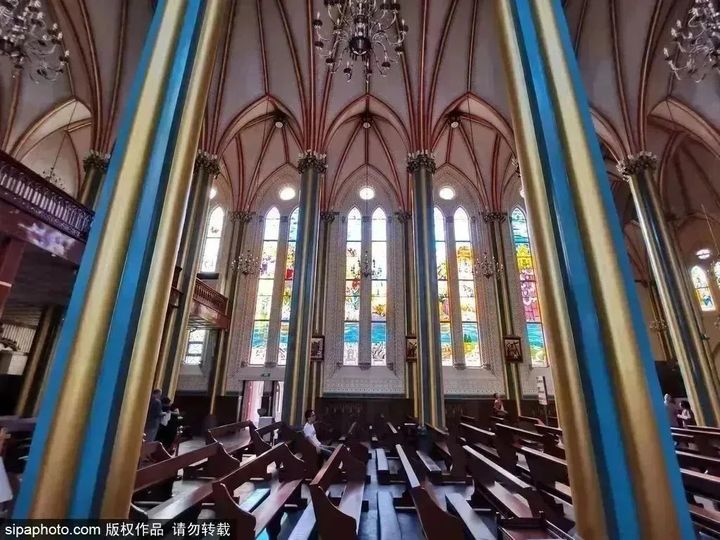 西什庫教堂是典型的哥特式建築,內部有鑲嵌畫和彩色玻璃畫,陽光射入,眼前是一片五光十色、璀璨晶瑩的奇景,顯得輝煌而神秘。
