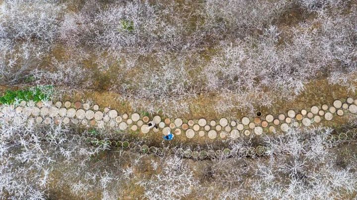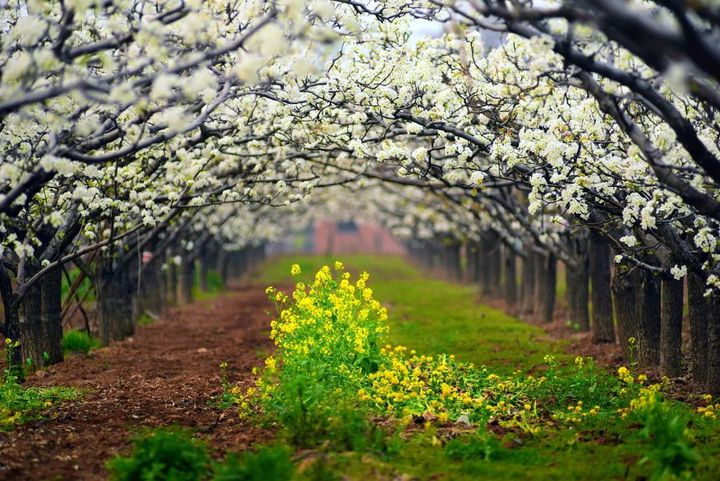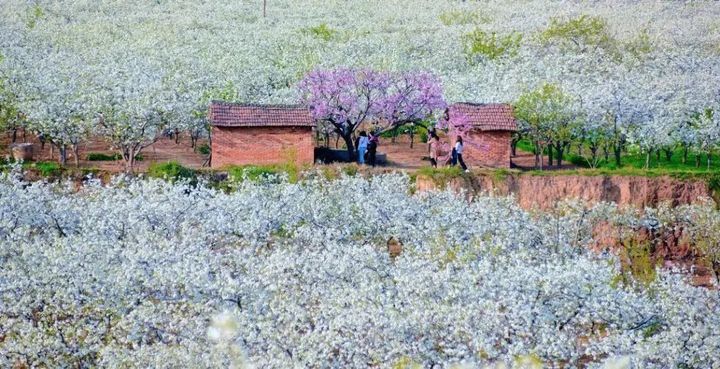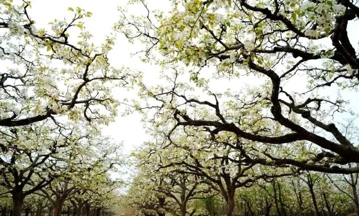 村裡村外,雪白的梨花佈滿枝頭,走進梨園,如入仙境。