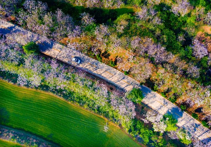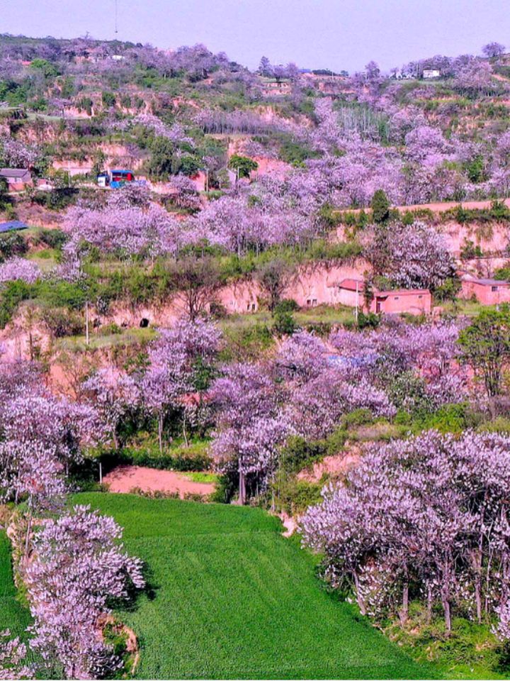 每到四月中旬,滿山遍野的泡桐花競相綻放,一個個小山村被大片大片的淡紫色桐花所籠罩,形成一道獨特的花海風景線。