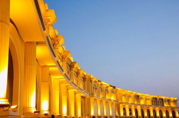 日落時分,坐在覽山公園的臺階上,感受晴天裡的陽光格外溫暖,背景中的銅黃色復古式歐洲外牆金光燦燦極為打眼。