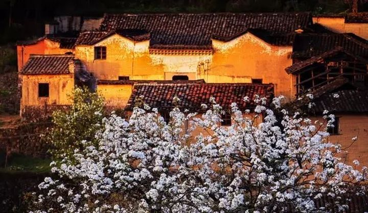 車盤坑村,一個已有480多年歷史的古村落,因全村村舍沿溪而建,環繞兩山之間,形如車盤,故名「車盤坑」。。 村內清一色的黃泥牆體的房屋錯落有致,上百棵樹齡三百餘年的梨樹環村而立,每到花開時節,雪白色的花朵映襯著黃泥黑瓦,分外美麗,堪比世外桃源。