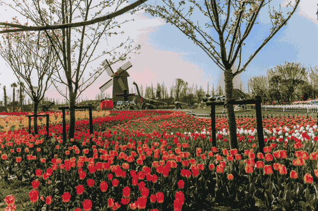 春天踏青賞花,當然最不能錯過的就是被譽為“花中皇后”的鬱金香了。 雲瀾灣百萬鬱金香,花香撲鼻,美不勝收,還有一排排櫻花林相互簇擁,編織花海美景。 清波粼粼的小河畔,碧草如茵的平原上,大片大片的鬱金香縱情怒放,已成一片花海。