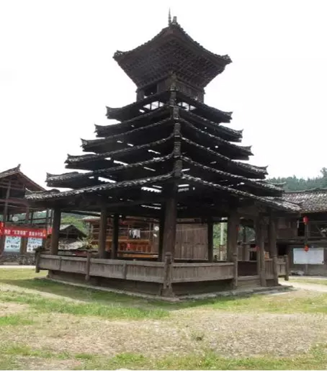 最後,還應該說鼓樓是對漢族建築樣式的借用。侗族鼓樓的頂端部分完全是借用漢族建築中的宮殿亭塔的式樣,這是漢侗文化交流的結果,從侗族鼓樓的頂端設計來看,其目的是象徵著閣頂部位的尊貴品位。漢族文化中,按禮儀,這些種類的屋頂只有在王公貴族的建築物上才能夠使用,而鼓樓的頂部形式卻都使用了這些種類的屋頂,幾乎每一座鼓樓頂部都使用了非常複雜的斗拱裝飾。斗拱在中國漢族建築的使用中逐漸成為權貴、權威、等級、地位、身份的一種建築文化符號,曾經一度只有宮殿、廟宇等建築才允許在立柱上和內外簷的枋上安裝斗拱,並以斗拱尺度的大小和層數的多少來表示建築的倫理品位,侗族鼓樓在頂部亭閣的簷枋處採用斗拱裝飾,除了力學上的需要之外,更主要的還是文化上的原因。換言之,帶斗拱的,高貴的廡殿式、宮闕式或攢尖頂式的亭閣樓頂,就是鼓樓的象徵,而在它之下的圍繞四周的各級披簷是村寨民居的象徵。
