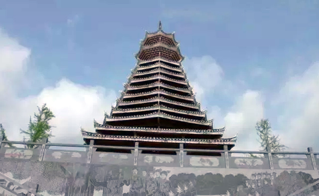 其實鼓樓身上還有很多符號,比如說鼓樓身上雕塑、繪畫、紋飾、楹聯等,這也是鼓樓樓身上的一種表層的文化符號體系,它有機地融合了堂、樓、屋、亭、塔、閣、殿、杉樹、龍、魚窩、仙鶴、村寨等形象。在綜合這些形象的同時,侗族的鼓樓建築匠師也有意無意地運用著這些物象所具有的象徵含義,由此而創造出這麼一種立體的多層次的建築文化。所以,侗族文化被專家學者稱之為“鼓樓文化”,不僅因為鼓樓是侗族建築中的傑出代表,更主要的是侗族的全部精神性的文化要素,從歷史記憶、宗教信仰、藝術娛樂到法律、習俗、節慶、交往等等諸多方面都離不開鼓樓。如果說太極圖是中國漢文化最具有原型性、積澱最深厚、可闡釋性最強、最有代表性的文化符號的話,那麼,鼓樓之于侗族文化來說,也是最具象徵性的文化符號,其中積澱和蘊藏著侗族最重要的文化元素,以鼓樓為中心而展開閱讀的視線,幾乎可以洞觀侗族文化的全幅圖景。