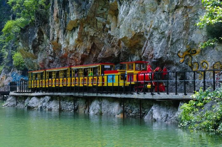 除了遊山玩水,九龍瀑內的遊玩項目“小火車”也超有特色。紅色的車頭、黃色的車廂,獨具北歐風情的觀光火車,可可愛愛。火車經過的道路,一邊是懸崖,一邊是水潭,火車以緩慢的速度穿越峽谷,山明水秀盡入眼中。