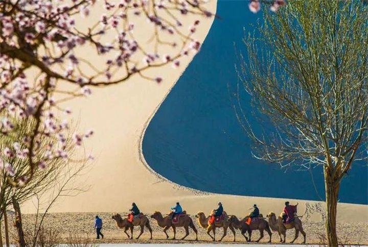 進入四月,敦煌鳴沙山下的李廣杏花漸次盛開,粉白的花瓣綴滿枝頭,放眼望去,一片絢爛景象,漫步其間,盡情享受大自然的美麗風光。