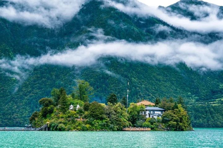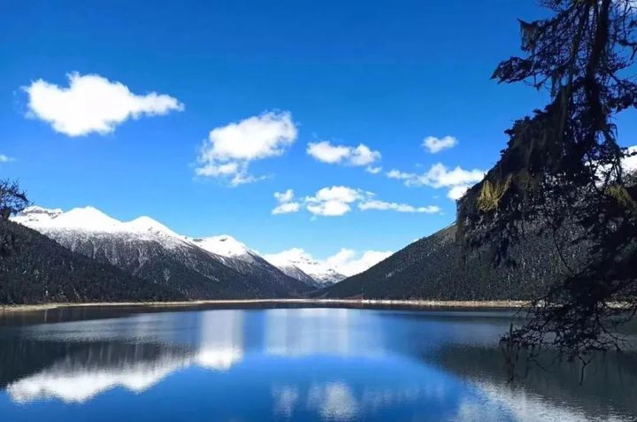 巴松措,目之所及,皆是綠色。 它的形狀就像是一輪新月,湖水清澈見底,四周雪山和原始森林倒映其中。 溫柔的風吹拂樹梢,吹拂你自由的心情。