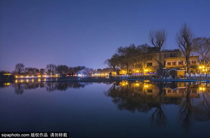 當夕陽將湖面鍍上一層金色的光輝,這便是北京城裡一份別樣的溫柔景象。夜晚華燈初上,什刹海沿岸亮起點點燈光,小橋、流水、民居……一切都顯得那麼靜美。