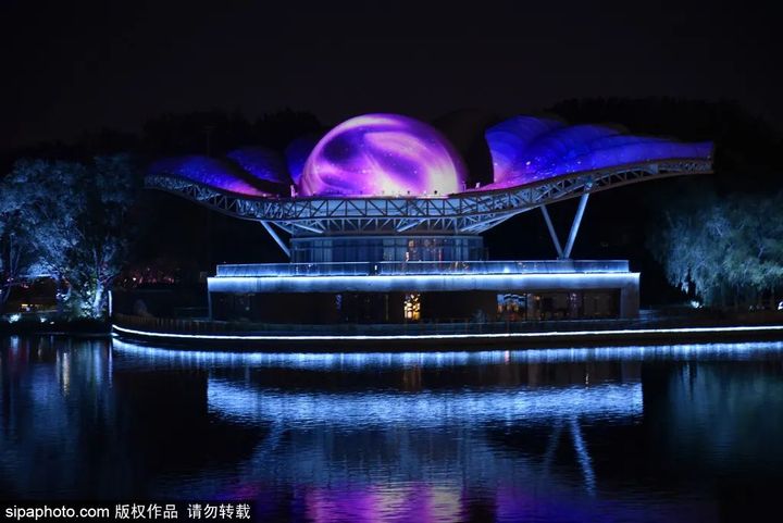 夜幕低垂,朝陽公園荷花湖中心島的貝殼劇場被燈光點亮,宛如童話世界,向東眺望,彼岸藍色港灣的燈火熠熠生輝,夜空、湖面被暈染得流光溢彩。坐在湖畔長椅上的遊人閉目養神,手邊的音響放著舒緩的音樂,像是文藝電影裡的場景一般。