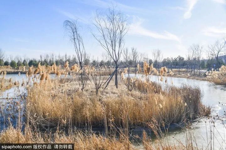 藍天與園景相映,水面被冰封分割成不同的色塊,蘆葦隨風起舞,水鳥棲息,為公園增添了幾分情趣。