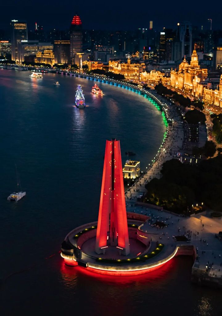 人民英雄紀念塔既是承載著紅色記憶的紀念性建築,又是“一江一河”的彙聚處,也是點亮浦江夜景的起點。紀念塔的燈光設計在原有的紅色基底上利用鐳射增設了呈上升形態的“星火”動態效果,運用雙色溫技術在紀念塔底座臨江部分打造 “紅底金星”的景觀效果,與外灘水景燈光相呼應,呈現“星耀東方”“星星之火”“薪火相傳”三種動態模式,可根據不同活動的需要隨意切換。