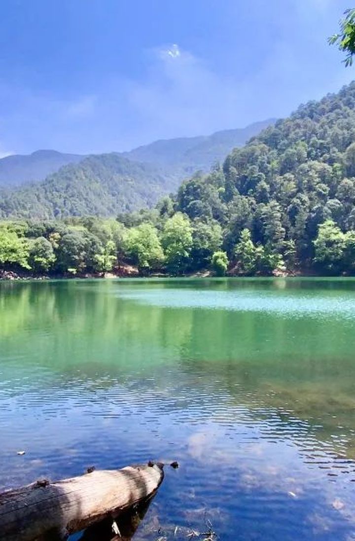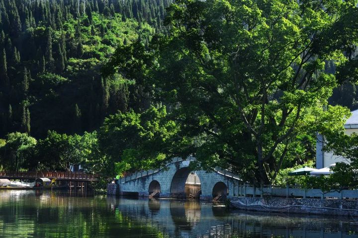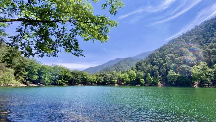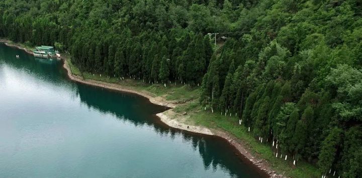 這裡群山環抱,岸上植被茂密,遍佈鬱鬱蔥蔥的樹林當你行走其間,陽光穿過樹葉間的空隙,灑在身上,瞬間帶你進入唯美的電影場景。