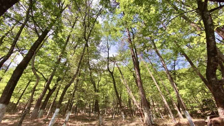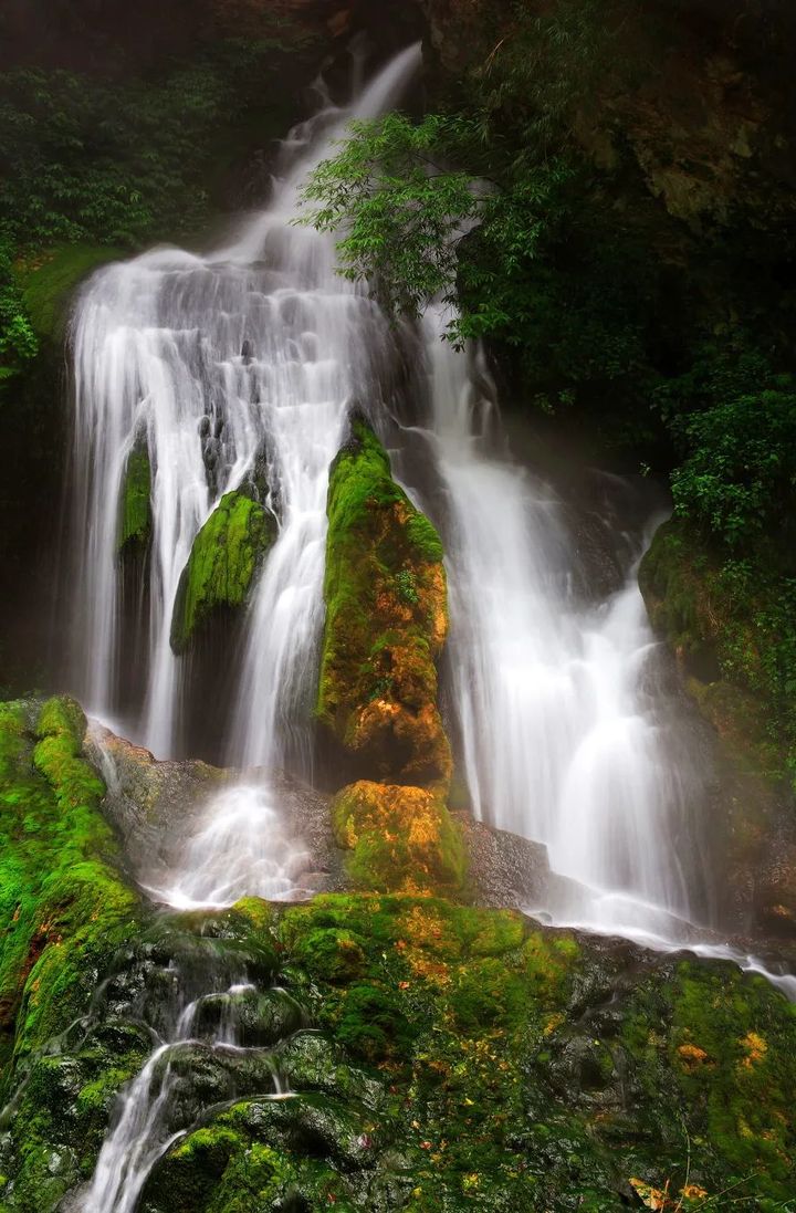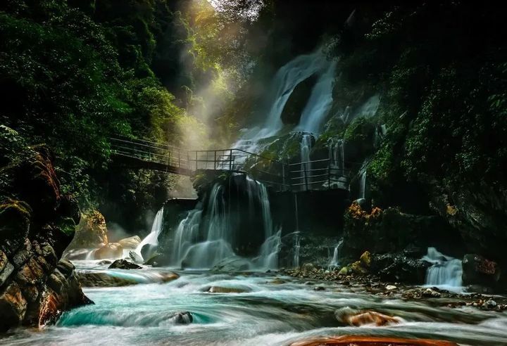 茂盛的樹木遮天蔽日,山澗裡泉水叮咚流淌,林中小徑,曲徑通幽。穿行在茂密森林中,偶有斑駁的陽光透過密林,灑下夢幻般的光影。