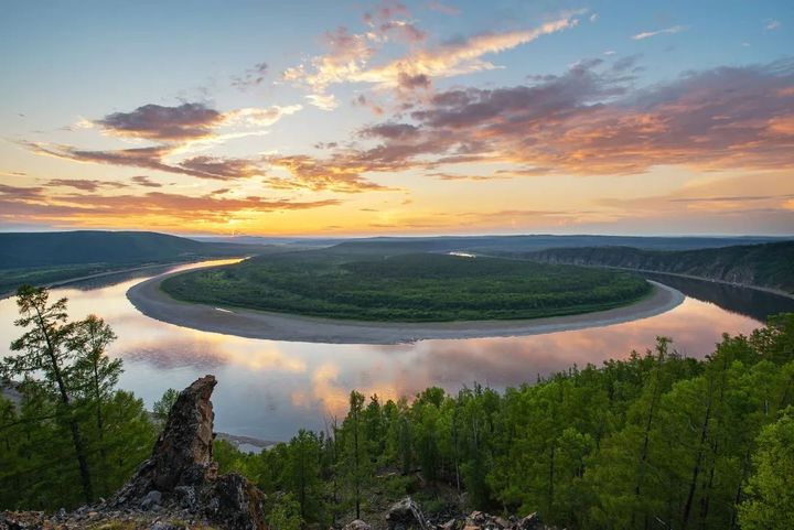 登上漠河龍江第一灣觀景台,白雲在天空,在江面流淌,江面的江風吹起層層雲煙,交織穿梭在綠葉森林間,如水流般綿長細膩,映得青山滴翠,綠意盡顯。