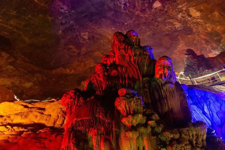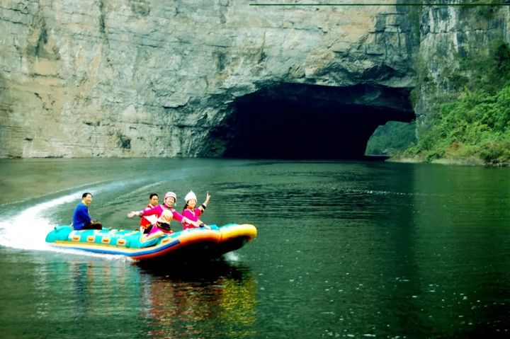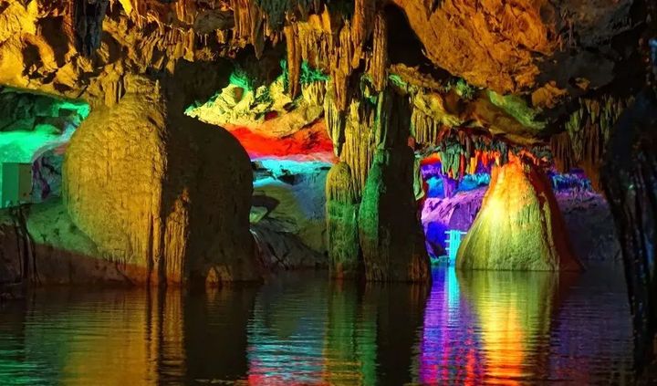 乘船劃水而行,槳聲在靜謐的洞中迴響,仿若流轉回溯到上古時空。洞內奇觀奇景,洞外綠樹成蔭、流水潺潺,漫步山林中、洞穴中,涼風可以一掃夏日的燥熱。