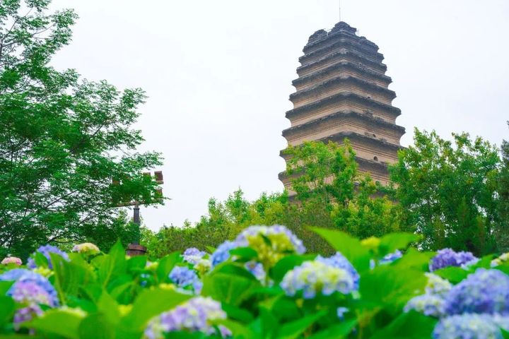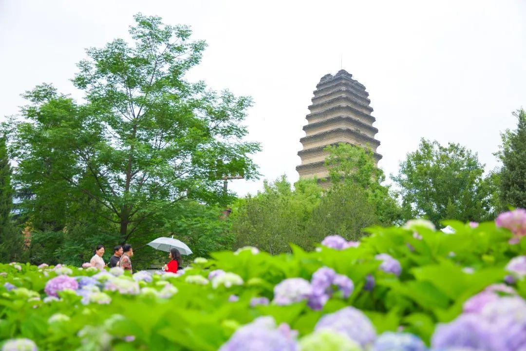 小雁塔繡球相繼綻放