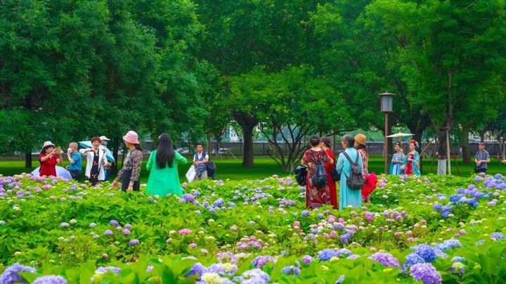 爭先恐後的一睹小雁塔繡球花海的芳容