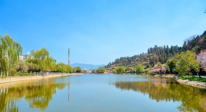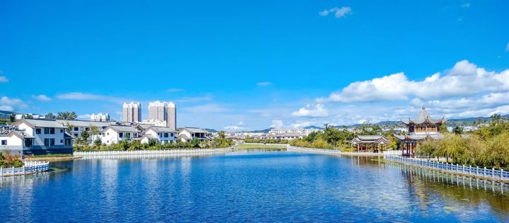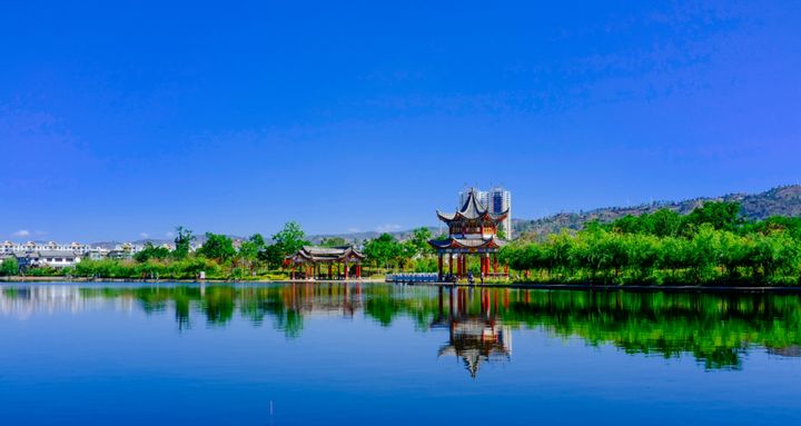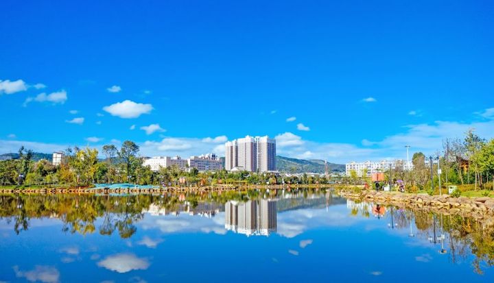 與城市和諧地融為一體的西河印象景區,是大姚的天然氧吧與休閒勝地。漫步在蜻蛉湖濕地公園,步行道旁綠樹成蔭,花繁似錦,湖光林色交相輝映,在湖中仿若能夠看到另外一個美好世界,那裡也有著藍天白雲和自由的飛鳥,充滿彝族風情的建築整齊劃一,行人悠然自得享受悠閒快活的時光,水天一色,碧波蕩漾。