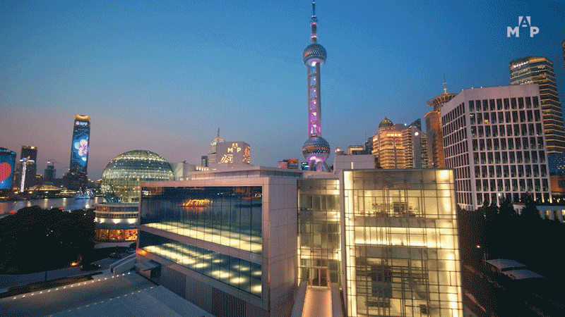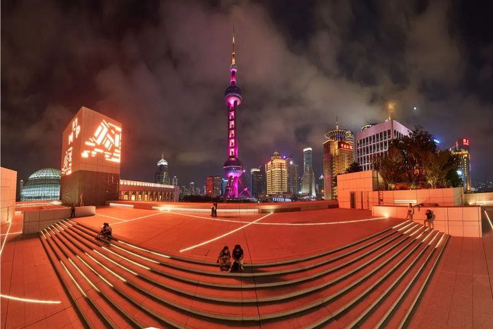 從上方俯瞰,頂層潔白的地面被至上主義風格的內嵌燈切割成各種各樣的不規則形狀。在閃亮的MAP LOGO與東方明珠塔下,人們可以靜靜坐在臺階上看著夜景發呆,消磨時光。