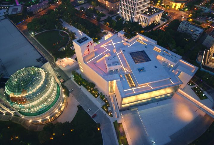 同時,夜晚的MAP領地也呈現出另一番模樣。由白色花崗岩鋪成的領地被夏日的晴朗夜空染成深藍色,並與鏡廳表面反射出的天空相互映襯,在陸家嘴濱江的天際線下組成一幅靜謐的畫卷。
