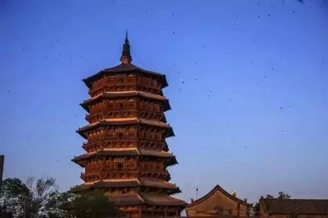 應縣木塔與義大利比薩斜塔、巴黎埃菲爾鐵塔並稱“世界三大奇塔”。全塔耗材紅松木料3,000立方公尺,2,600多噸,純木結構、無釘無鉚。塔內供奉著兩顆釋迦牟尼佛牙舍利。