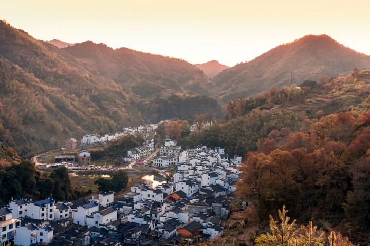 秋風仿佛一把巨大的畫筆,在婺源的山嶺間肆意塗抹。