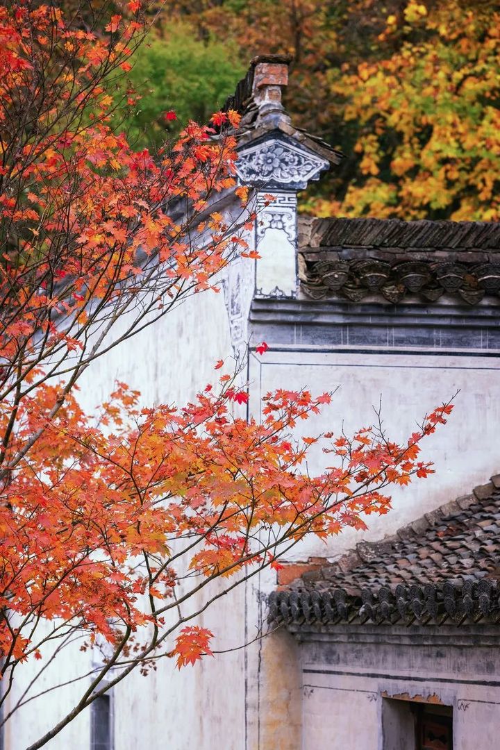 白牆黑瓦間,盡是古韻,紅楓如火。