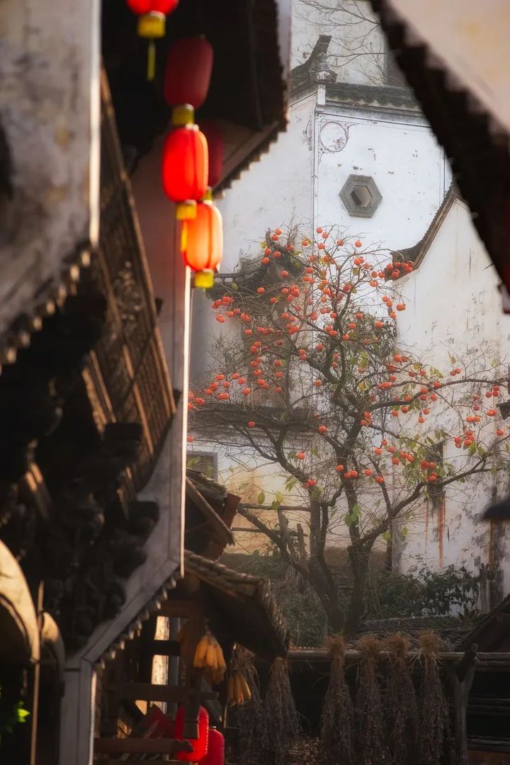掛在屋簷下的紅燈籠,和掛在枝頭的紅柿子,彌漫在空氣中的煙火氣。