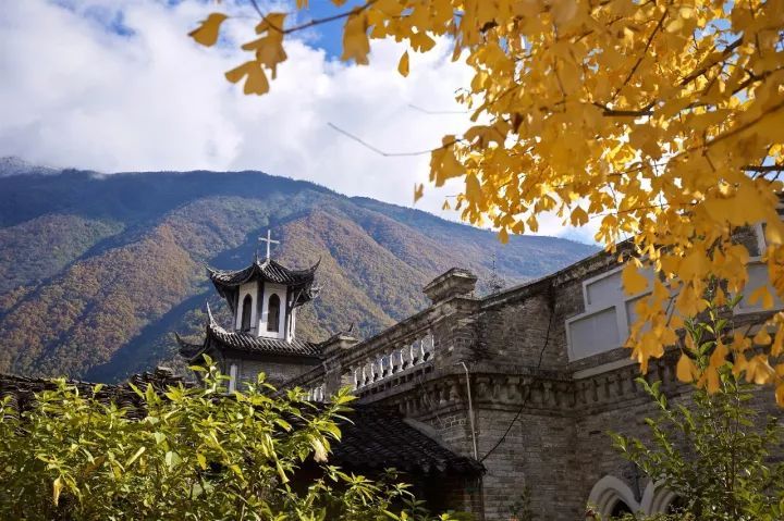 清代建築格調的農舍,白牆黑瓦,層層疊疊,錯落有致,與豔麗的海螺溝秋景相互交融,不聒不噪,美得明媚動人。