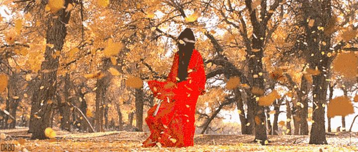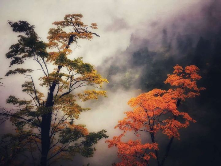秋日的原始森林,如同張藝謀電影《英雄》的片段。
