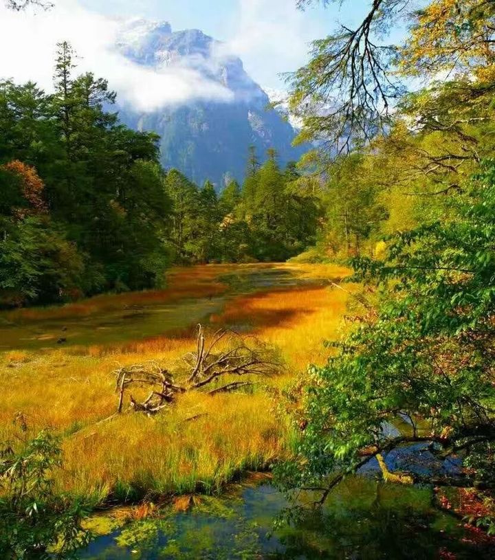 而秋天的貢嘎山,處處流淌著溫暖的顏色,“金陽”的秋色,如北極星的光暈在峽谷間肆意流動,追逐嬉戲,相映成趣。一改往日的冷靜嚴肅。