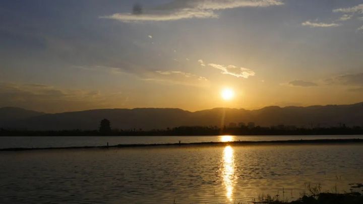 晚秋的陽光,別有韻味。少年們坐在高山之巔、站在彩虹橋上,感受溫度恰到好處的夕陽沐浴全身,看陽光和行人從樹枝穿過,耀眼的金色縷縷撒在湖面、山巒、樹林和沙灘。西邊升起了一朵蘑菇雲,孩童手執漁網,捕捉縷縷金色。夕陽躲進山的背後,天空和湖面被染成緋紅,由明亮豁達、輕柔歡快變得暗沉肅靜、溫馨靜謐,如恢宏巨制的大型油畫。當夕陽收起最後一絲光亮,湖裡蛙聲片片,岸邊蟬鳴聲聲,林間鳥語陣陣,廣場上樂曲聲聲,恬淡清涼的黃昏駛向湖的彼岸。