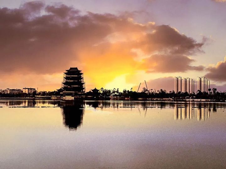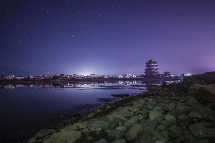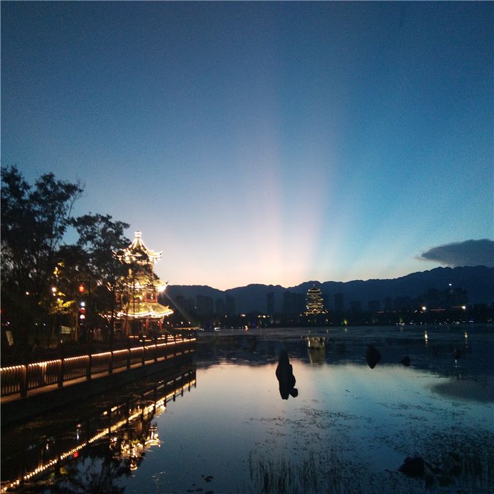 秋天的天,開始黑得很快。當天邊最後一絲雲彩如沾滿墨汁的海綿時,昏暗的暮靄,漸漸低壓下來,天湖縫合了,無邊的湖面由湛藍變成了灰暗,夕陽拉下夜幕,夜的腳步聲漸漸聚攏,充斥著濃重古典氣息路燈依次亮起,泛著柔柔的光,彩虹橋上的霓虹燈閃閃爍爍,如繁星點亮夜空,在亭子燈光的照射下,湖面變得金碧輝煌。一彎新月悄然升起,散發著明亮皎潔的光,湖面清晰倒映出毛公山輪廓。