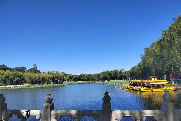 “北海可以划船——雖然荷花已殘,荷葉可還有一片清香。”這是老舍對於秋天北海的評價。在太陽當頭的正午,微涼的秋風吹過,湖面水光瀲灩,如同碎鑽隨著水波蕩漾。蕩舟湖面,手邊是水墨畫般的荷葉蓮蓬,遠處是粼粼波光,微風徐徐,別有一番秋天的風味在裡面。
