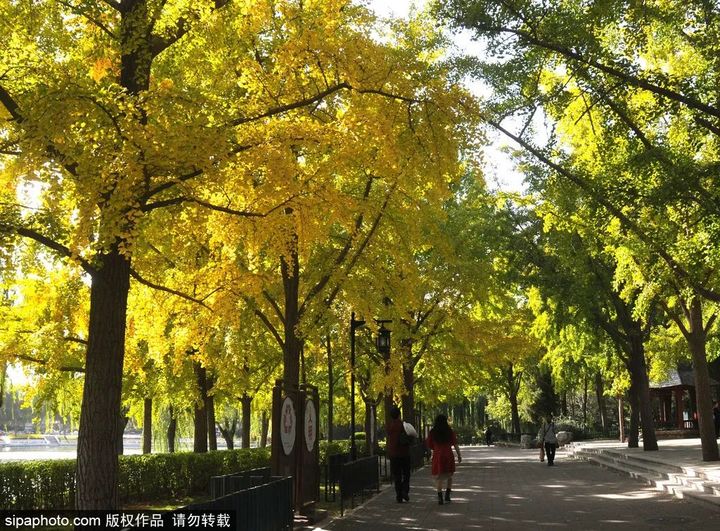 從北門進入陶然亭,是一條200公尺長的銀杏大道,深秋一至,滿樹金黃。