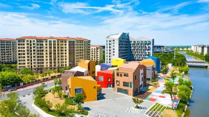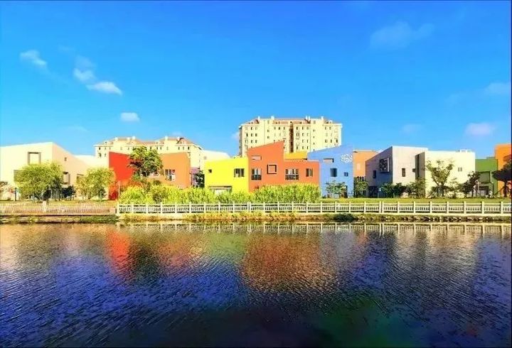 紅橙黃綠青藍紫...... 各色小房子像魔方散落在夏漣河畔,造型獨具一格,色彩搭配和諧,給臨港增加了一抹靚麗的彩色。