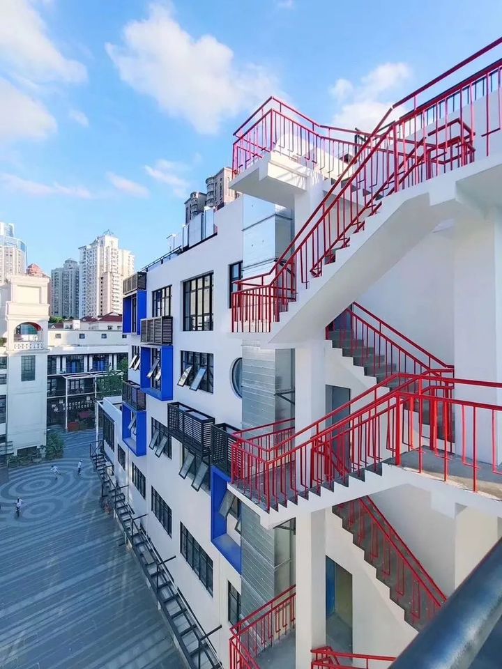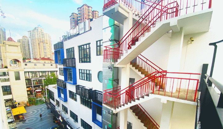 創享塔文化園區內的每一棟建築上,都有蒙德里安風格經典的“紅黃藍”。在黑白建築外牆上顯得格外青春跳脫,就像一個個彩色房子。位於主樓一角的紅白樓梯,也是拍照好去處。尋個好天氣,幾乎不需要調色,無需濾鏡,就能拍出大片!