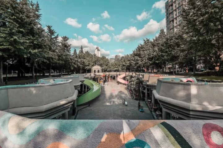 158坊是在一片花園中的下沉式廣場,從上空俯視而下宛如魔都的眼睛,上層圍牆繪製著多國旗幟的色彩塗鴉,年輕氣息撲面而來。獨特的地理位置和設計,也經常吸引老外前來,連狗狗都愛來~