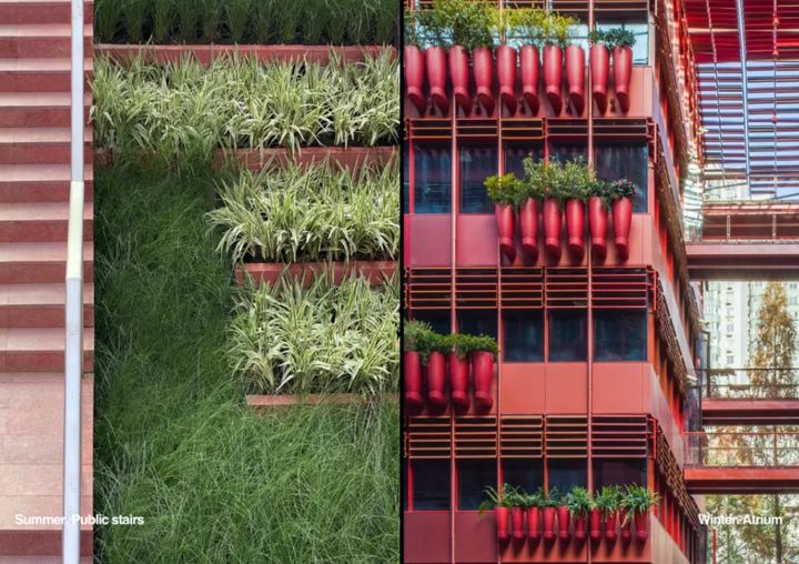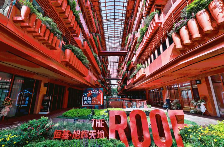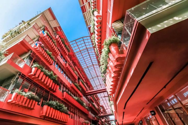 新天地商圈最搶眼的存在,建築設計是它最大的亮點了,140公尺半開半合的全景天幕玻璃屋頂,熱情似火的丹霞紅色,懸空的2500個花缽,50個觀景露臺...簡直就是一座立體式花園!