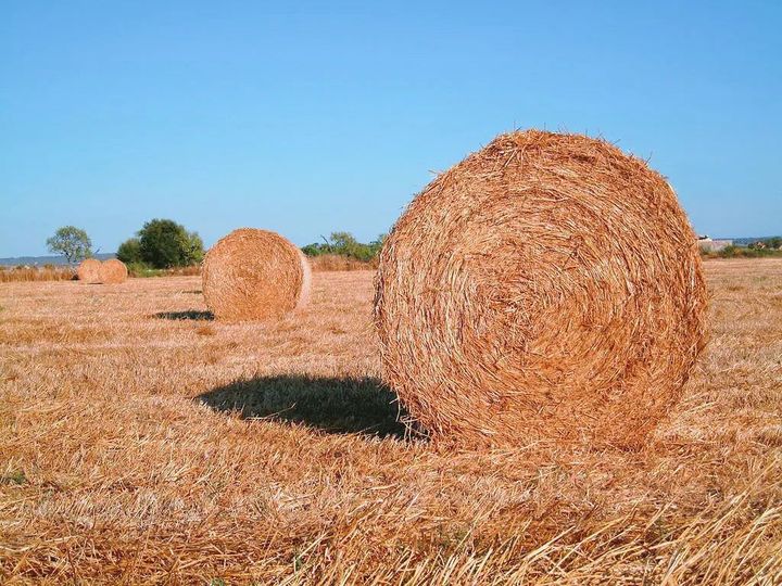 收割後的豆子,打成的結實草捆,錯落有致地散佈在山腳下,黃酥酥,圓滾滾,好像地毯上和諧立體的圖案。