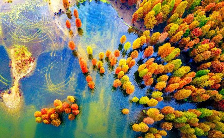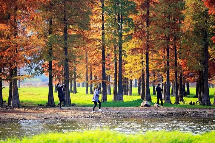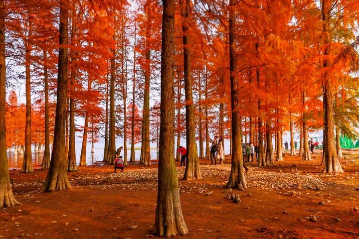每到秋天,上帝都會情不自禁地將染缸打碎,把顏料倒在四明湖的池杉樹上。這片池杉林是上世紀五十年代,四明湖水庫開始建設的時期種下的。秋末的池杉樹顏色非常豐富,紅橙黃綠在陽光的斜射下很有層次感~