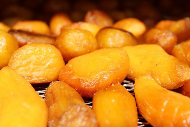 它是四明山的傳統特色美食,經過去皮、蒸煮、烘烤等一系列工藝,吃起來,只覺得有著牛皮糖的軟韌,且不粘牙,味道微甜爽口,清涼潤喉,真有似嚼山東大黑棗的滋味。