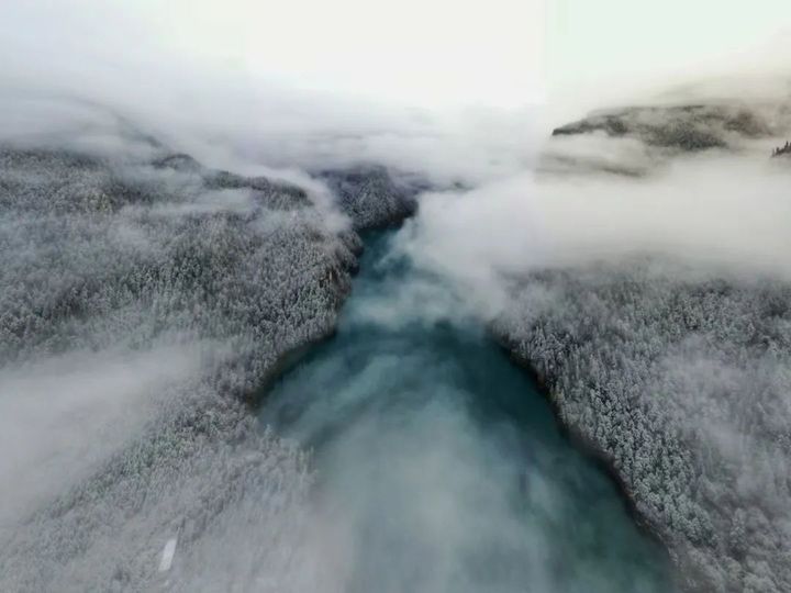 山中霧氣氤氳,繚繞白雪彩林間