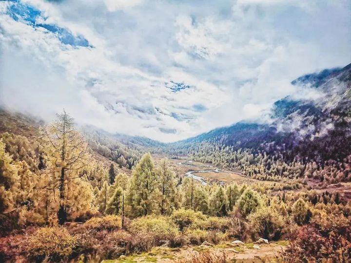 白雪將片片彩林和雲霧完美融合