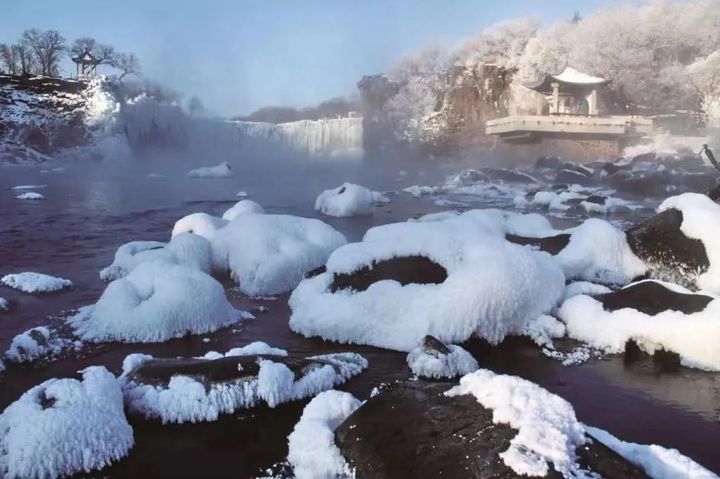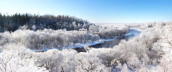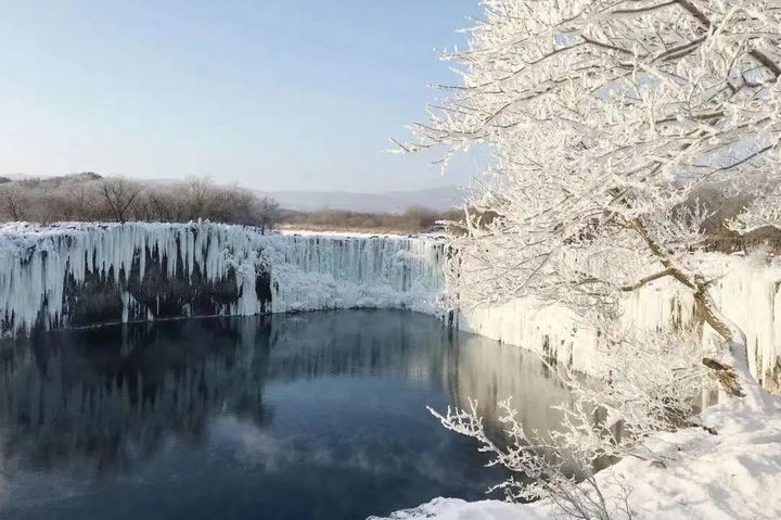 初冬的鏡泊湖流動的湖水、湖畔的霧凇以及積雪,構成了一幅完美而和諧的畫面,讓人心生嚮往。